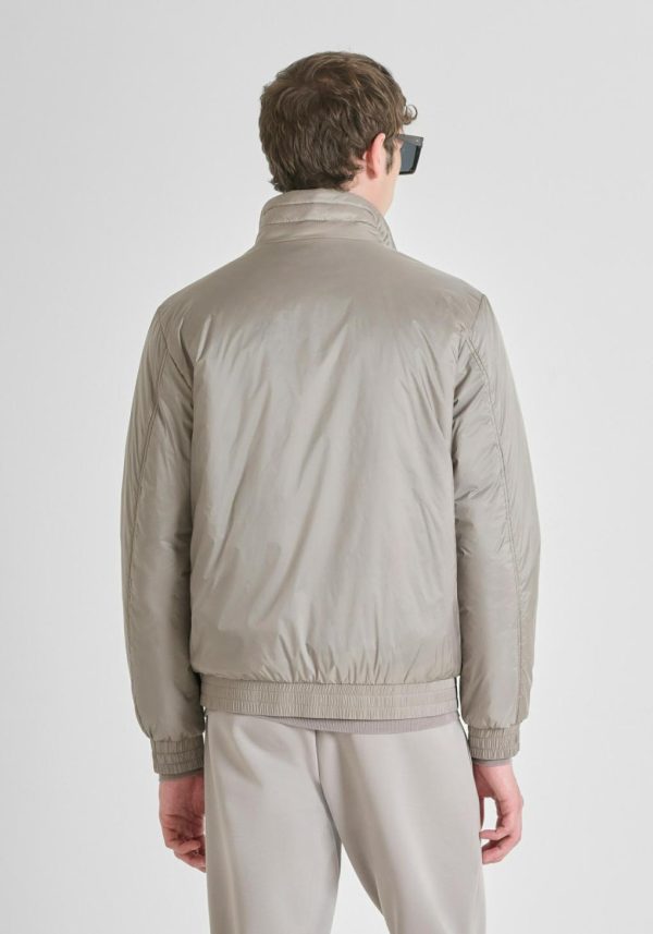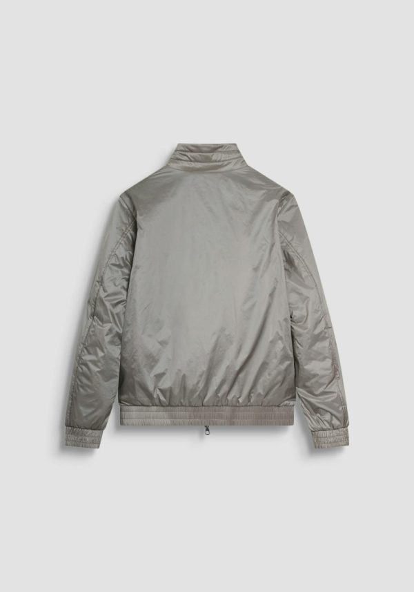 Regular fit bomber jacket, made of shiny nylon fabric. This fabric gives the garment resistance and versatility, both aesthetic and functional. Front zip closure with double slider, two front welt pockets. Patch logo applied on the front.