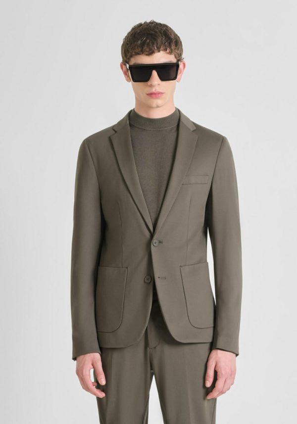 Single-breasted jacket with slim fit, two button fastening and classic lapel. Made of bi-stretch fabric suitable to accompany every movement and perfect to ensure high comfort. The model is completed by two large pockets, buttons on the bottom of the sleeve and small slit at the back.