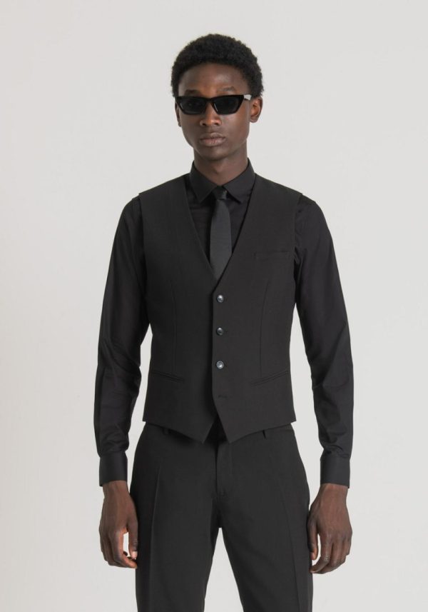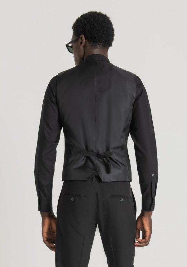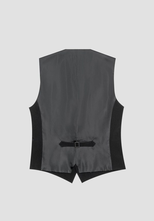 A slim fit waistcoat in a solid colour stretch viscose blend fabric. The closure is regulated by four buttons on the front, where there are also two welt pockets and a left breast pocket. The back is made with contrasting fabric and has a central slit and a martingale with a buckle. This is an iconic garment of the male wardrobe that is essential when creating elegant outfits.