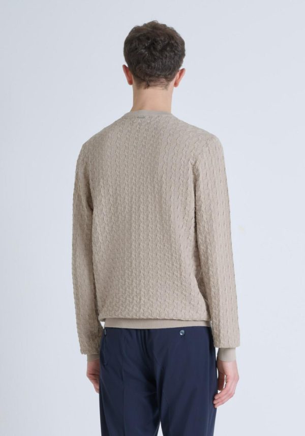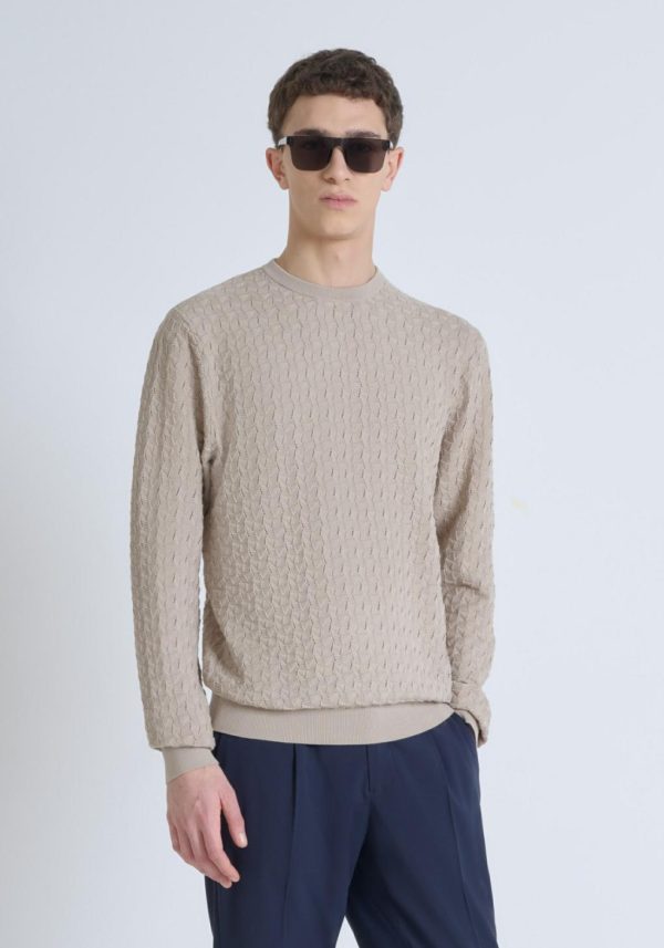 Elegant geometric embossing accentuates the silhouette of this crew-neck sweater by Antony Morato. Made entirely of soft cotton, its design features a loose fit that is comfortable to wear throughout the day. Collar, cuffs and bottom feature a ribbed weave construction. The logo plaque applied to the back of the collar finishes off the garment.