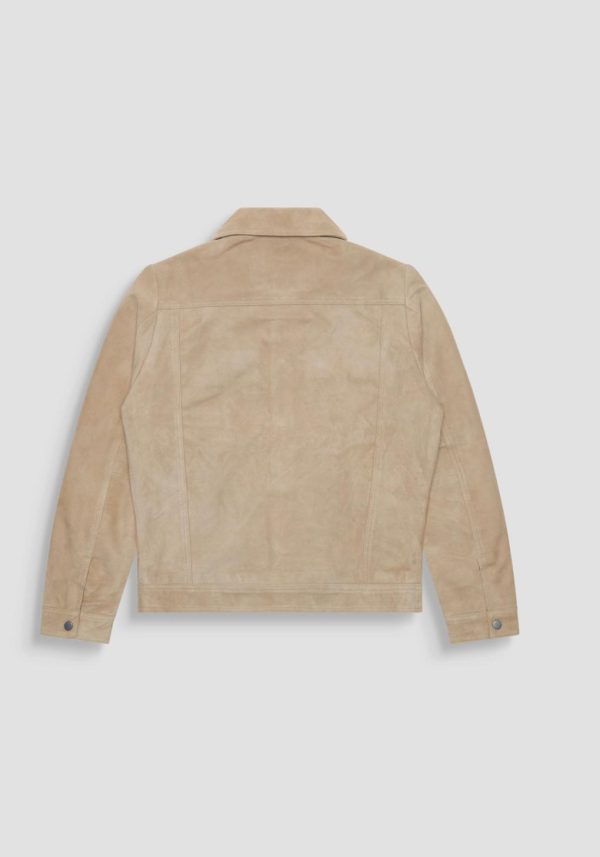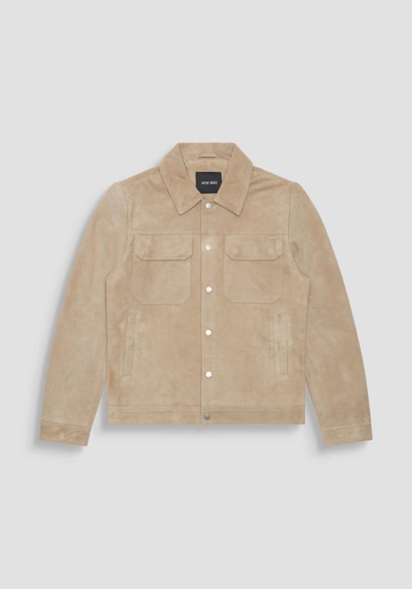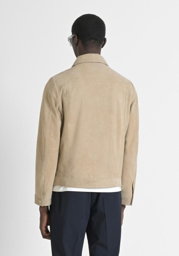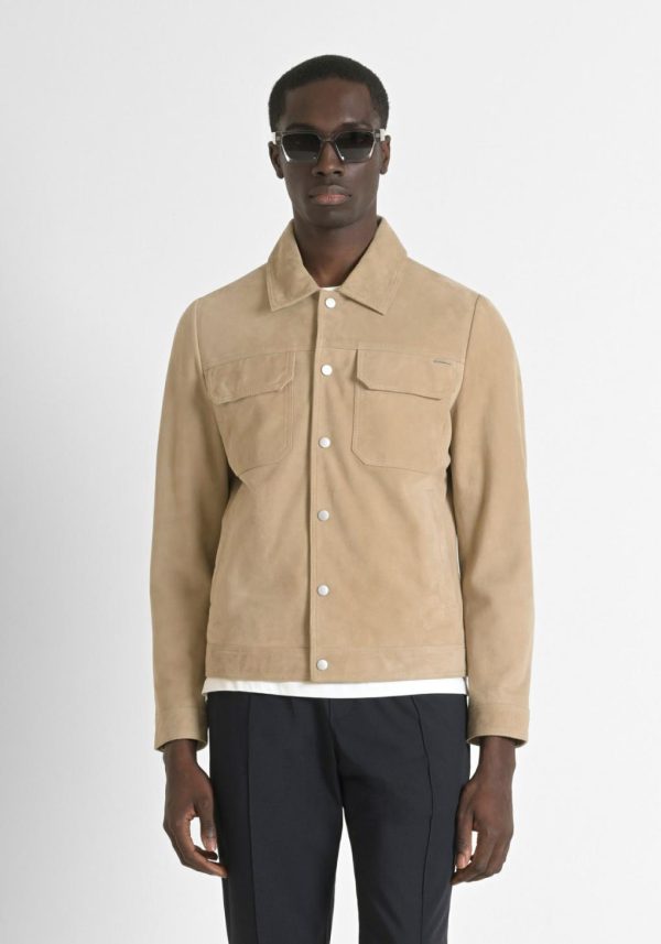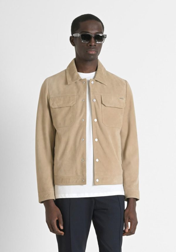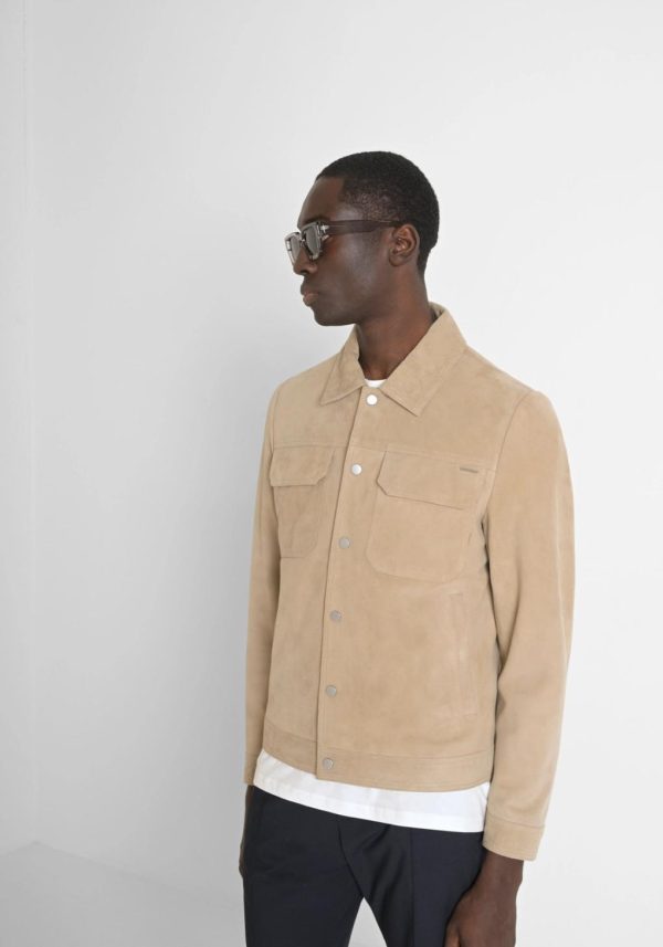 Antony Morato has designed this genuine suede-effect leather jacket. Crafted in a solid colour with a slim fit, it features a shirt-inspired collar and press-stud fastenings. The garment has four pockets: two patch pockets with flaps on the chest and two welt pockets on the hips. The sleeves have buttoned cuffs and there is a small logo tab on the chest.