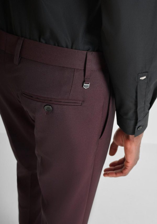 Antony Morato presents these premium slim fit trousers crafted from a soft, elastic viscose blend fabric with an elegant micro pattern design. Engineered for a tailored silhouette, these versatile pants feature a timeless style that makes them an essential staple in any modern wardrobe. The trousers include four functional pockets – two front slash pockets and two button-closure back pockets. Precision pin detailing along the leg and a discreet hidden closure provide sophisticated finishing touches.