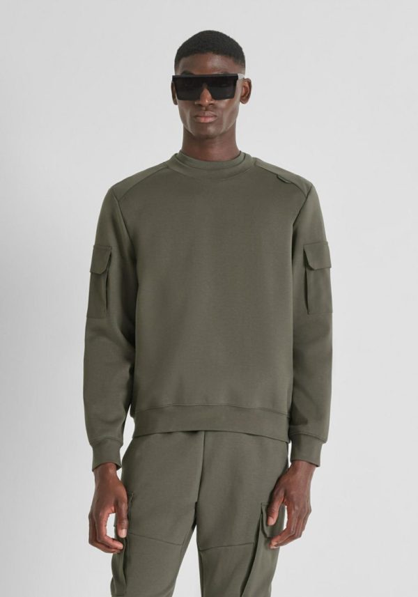 Experience superior comfort with our regular fit crew neck sweatshirt, crafted from premium cotton blend fabric with stylish contrasting viscose inserts. The distinctive contrasting fabric panels on sleeves and shoulders create a bold military-inspired aesthetic that elevates any casual outfit. Features elastic knit cuffs and bottom for a secure, comfortable fit. This versatile piece effortlessly transitions from day to night while making a strong style statement.