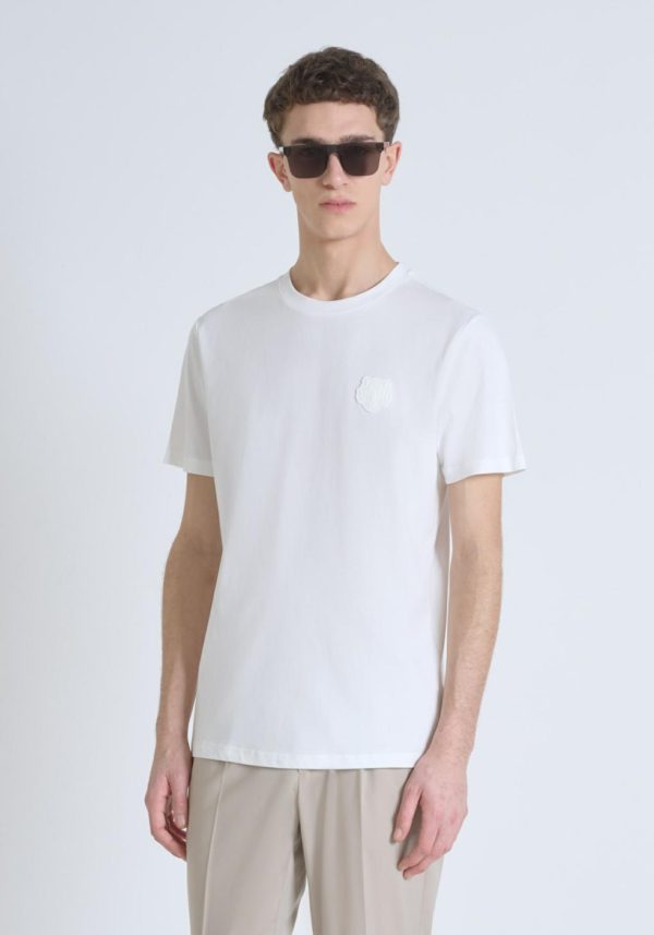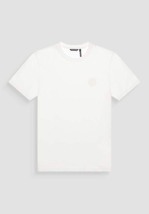 Elevate your casual wardrobe with this premium short-sleeved crew-neck T-shirt from Antony Morato, crafted from exceptionally soft cotton for all-day comfort. Designed in a versatile solid color with a classic regular fit, it features a sophisticated tone-on-tone tiger patch embroidery on the left chest. This effortlessly stylish tee seamlessly transitions from weekend casual to smart-casual occasions, making it a must-have foundation piece for any modern man’s collection.