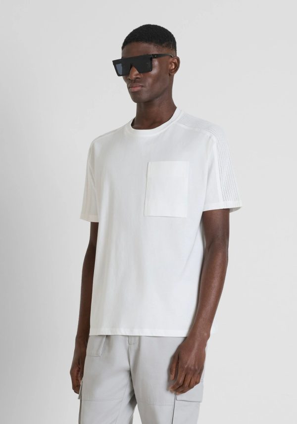 Elevate your summer style with this premium Antony Morato t-shirt featuring innovative perforated detailing that creates superior breathability across the shoulders and sleeves. Crafted from 100% premium cotton jersey, this short-sleeve tee offers a comfortable relaxed fit with a sleek tone-on-tone chest pocket. The signature metal logo plaque at the back neckline delivers sophisticated brand recognition that sets this piece apart.