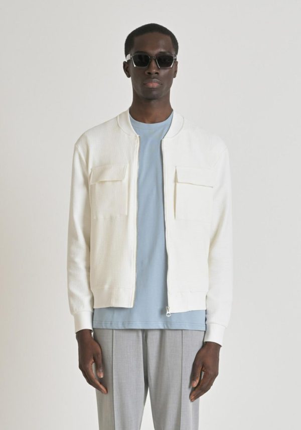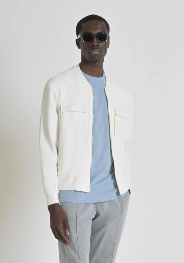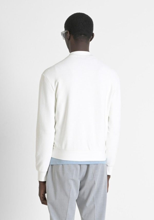 Elevate your casual wardrobe with this slim-fit sweatshirt crafted from premium stretch cotton featuring an all-over geometric check pattern. Designed for modern versatility, this essential piece features a convenient zip front, practical flap pockets, and tailored cuffs for a polished finish that transitions seamlessly from day to evening.
