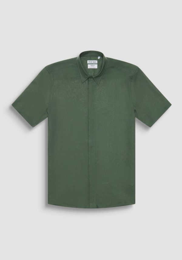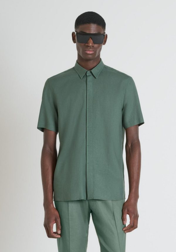 Short-sleeved shirt by Antony Morato. Made of soft touch linen-blend fabric, it has a regular fit. With an Italian collar, the shirt features a concealed closure with the exception of the first button. A small logo tab is sewn onto the back of the garment.