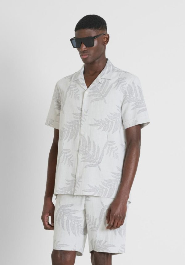Vintage-cut short-sleeved shirt, made of soft cotton with Jacquard workmanship embellished by a natural-style woven print in a contrasting colour. Camp collar with wide lapels, straight fit without darts on the back. Small metal logo tab sewn on the back. A real must-have for the summer season, it adds a touch of fresh and modern style.