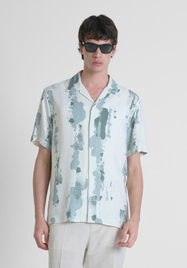 Vintage-cut short-sleeved shirt, made of viscose and linen fabric with abstract pattern print. Camp collar with wide lapels, straight fit without darts on the back. Small metal logo tab sewn on the back. A lightweight and versatile model, perfect for summer days.