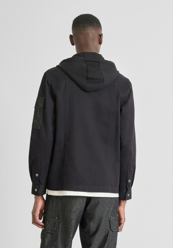 Hooded shirt with relaxed fit, made in cotton and viscose blend. Designed to be worn alone or as an oversize piece, over a t-shirt. Front closure with snap buttons, denim pocket applied on the sleeve with zip closure and flap. On the front, two flap pockets and two side welt pockets. Cuff with two buttons.
