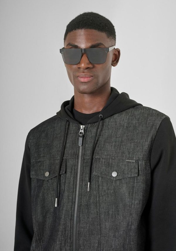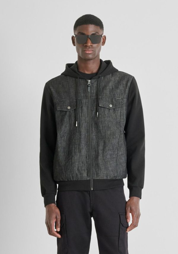 Regular fit hooded sweatshirt made in cotton blend fabric. Features a central zip, two small pockets on the front, drawstrings for hood adjustment and contrast knit sleeves. A garment dedicated to those seeking a casual piece, but also to be used as a jacket during the season change.