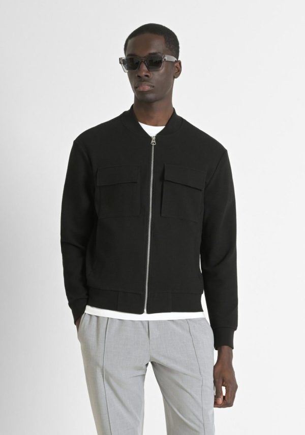 Solid-colour slim-fit sweatshirt in soft, stretch cotton. Versatile and perfect for finishing off any casual look, the design features a zip fastening and is characterised by cuffs, front flap pockets and an embossed all over geometric micro-pattern.