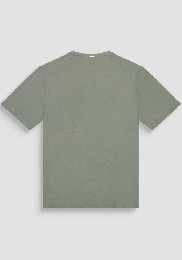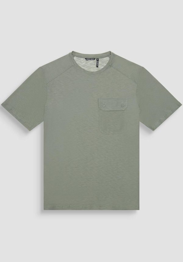Crew-neck cotton T-shirt with a pocket sewn on the chest. The pocket has a flap closed by two small buttons. Relaxed fit and small metal tag with logo sewn on the back of the crew neck.