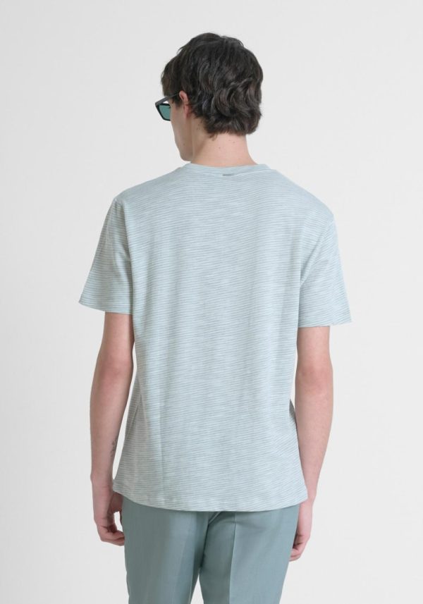 Crew-neck cotton T-shirt with micro-stripe pattern. The soft and lightweight fabric and relaxed fit make it a perfect T-shirt to wear with more casual looks. Small metal tag with logo sewn on the back of the crew neck.