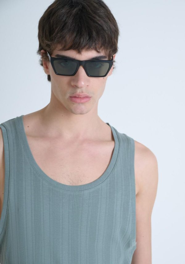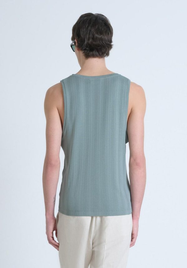 Crew-neck tank top with a slim fit and wide armholes. Made of soft cotton-blend Lyocell, it will be the perfect companion to use alone or as a base layer. The striped micro-weave gives an elegant touch to this casual garment. On the back, there is a small metal logo tab sewn along the crew neck.